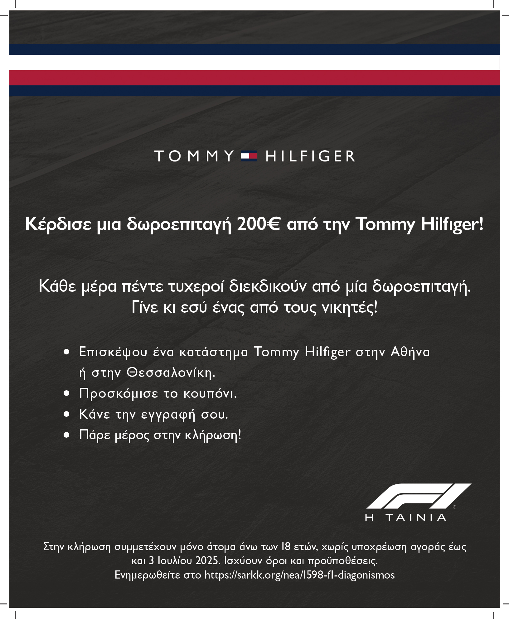 Πάρε κι εσύ μέρος στον διαγωνισμό "F1-H TAINIA" και γίνε ένας απο τους τυχερούς που μπορεί να κερδίσει μια δωροεπιταγή Tommy Hilfiger αξίας 200€ ! ΟΡΟΙ ΣΥΜΜΕΤΟΧΗΣ ΣΤΟΝ ΔΙΑΓΩΝΙΣΜΟ Η εταιρεία με την επωνυμία «SARKK AΝΩΝΥΜΗ ΕΤΑΙΡΕΙΑ ΕΜΠΟΡΙΑΣ ΕΙΔΩΝ ΕΝΔΥΣΕΩΣ ΚΑΙ ΥΠΟΔΗΣΕΩΣ» (εφεξής καλούμενη η «Διοργανώτρια»), η οποία εδρεύει στο Χαλάνδρι Αττικής (ΤΖΑΒΕΛΛΑ 67 & ΜΕΣΟΓΕΙΩΝ, Τ.Κ. 15231), με ΑΦΜ 094526950, ΚΕΦΟΔΕ Αττικής, όπως εκπροσωπείται νόμιμα, διοργανώνει διαγωνισμό με κλήρωση δώρων και τίτλο «F1 ΔΙΑΓΩΝΙΣΜΟΣ» (εφεξής «Διαγωνισμός»), ο οποίος θα διεξαχθεί στα φυσικά κατάστημα Tommy Hilfiger που...